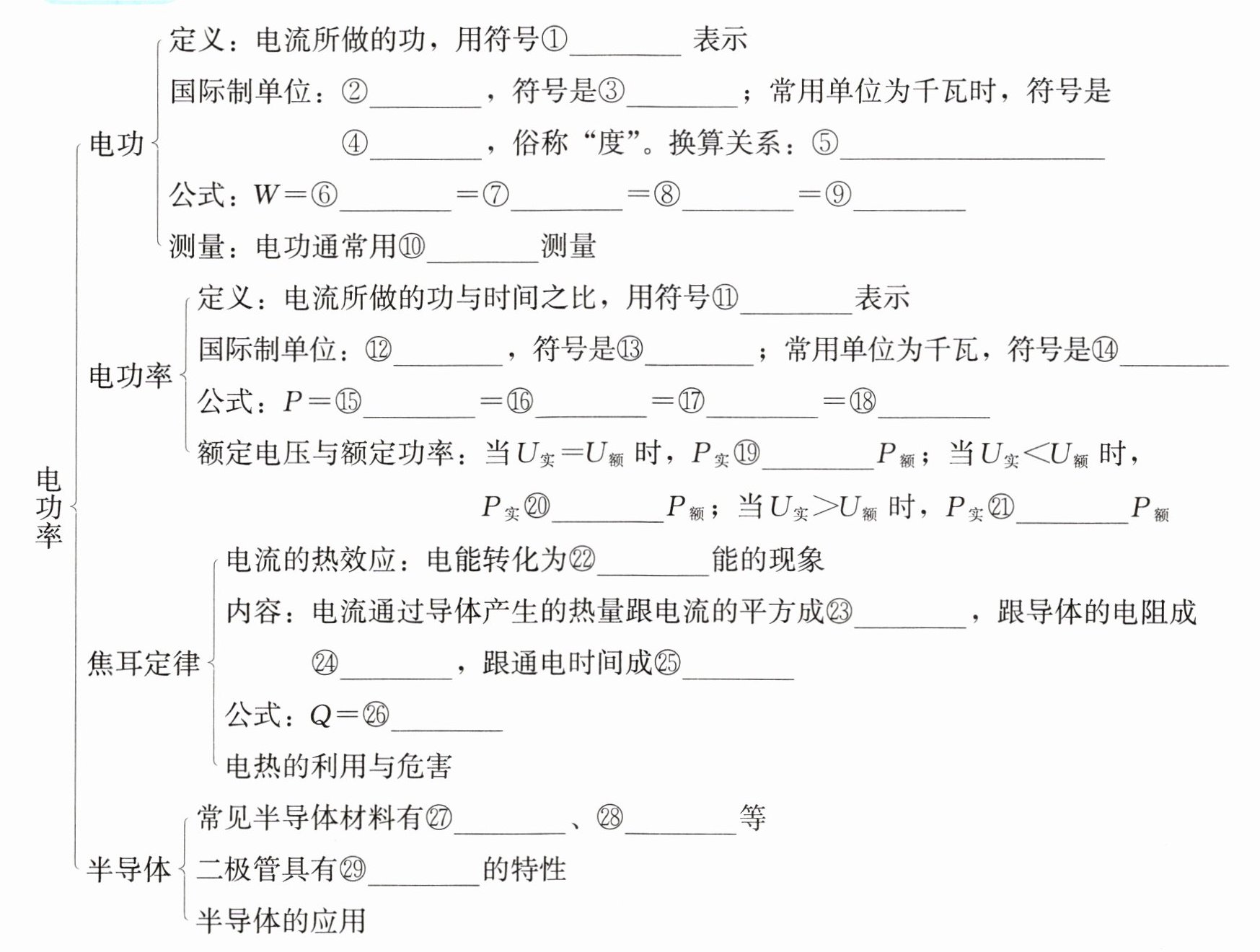 ①W ②焦耳 ③J ④kW·h ⑤1kW·h=3.6×10⁶J ⑥UIt ⑦I²Rt ⑧U²t/R ⑨Pt ⑩电能表 ⑪P ⑫瓦特 ⑬W ⑭kW ⑮W/t ⑯UI ⑰I²R ⑱U²/R ⑲= ⑳< ㉑> ㉒内 ㉓正比 ㉔正比 ㉕正比 ㉖I²Rt ㉗硅 ㉘锗 ㉙单向导电