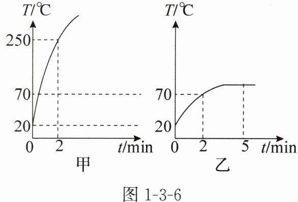 11. 某物理兴趣小组的同学在研究“沙子和水谁的吸热本领大”时,选用了两个完全相同的酒精灯分别给质量都是 $ 200 \, g $ 的沙子和水加热,他们绘制出沙子与水的温度随加热时间变化的图像如图 1 - 3 - 6 甲、乙所示。已知酒精的热值是 $ 3.0×10^{7} \, J/kg $,水的比热容是 $ 4.2×10^{3} \, J/(kg·℃) $,加热时酒精灯平均每分钟消耗 $ 0.8 \, g $ 酒精。(对应目标:911304)