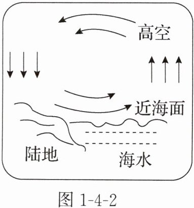 2. 暑假期间,小红来到美丽的海滨城市游玩。在这里她发现,白天的风从海面吹向陆地,而在夜晚风却从陆地吹向海面。陆地和海面之间空气流动情况的示意图如图1-4-2所示,由此可知此时正是