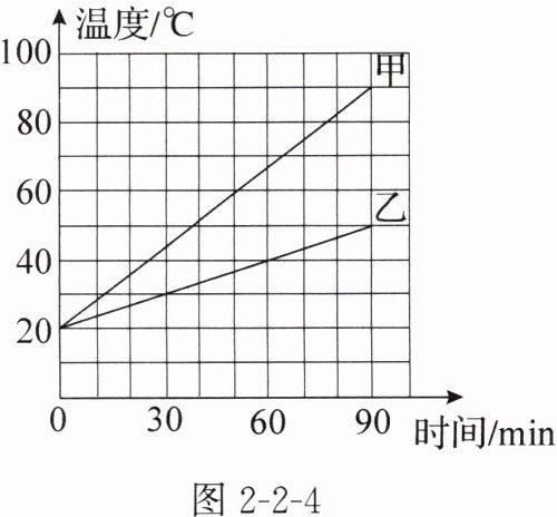 11. 在一个标准大气压下,用两个规格相同的酒精灯分别对甲和乙液体进行加热,其温度随时间变化的关系如图 2-2-4 所示。已知乙液体是水,那么质量为 500 g、初温为 20 ℃的乙液体吸收$ 2.1×10^{5} J $的热量,可使乙液体的温度升高