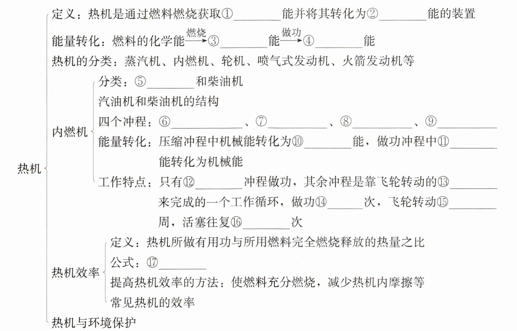 ①内;②机械;③内;④机械;⑤汽油机;⑥吸气冲程;⑦压缩冲程;⑧做功冲程;⑨排气冲程;⑩内;⑪内;⑫做功;⑬惯性;⑭1;⑮2;⑯2;⑰η=W有/Q放×100%