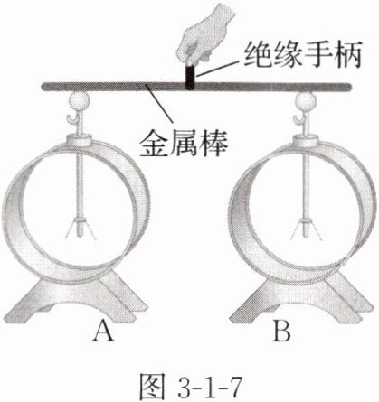 电;图 3 - 1 - 7 中用带有绝缘手柄的金属棒将验电器$A$和$B$连接起来的瞬间,验电器$A$的金属箔张开,说明验电器$A$的金属箔失去