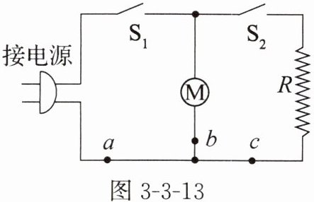 13. 某取暖器的简化工作电路图如图 3 - 3 - 13 所示。图中元件$M$是装有扇叶的电动机,元件$R$通电时会产生热量。若要取暖器送暖风,应闭合开关