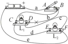 (选填“串联”或“并联”)的正确电路。(3)小强将多余的$c$导线拆除以后,闭合开关时,小灯泡$L_{1}$、$L_{2}$都不亮。用一根导线的两端接触$A$、$B$两点时,两灯都不亮;接触$C$、$D$两点时,两灯也不亮;接触$E$、$F$两点时,只有灯$L_{1}$亮。对此,下列判断正确的是