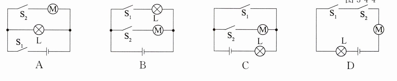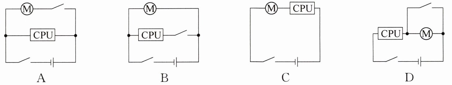 6. 电脑正常工作时,中央处理器(即 CPU)不断发热,必须用风扇给予降温。为了保证中央处理器不被烧坏,在工作之前,带动风扇的电动机要先启动,中央处理器断电后,电动机仍能工作很长一段时间来进行散热,图 3 - 4 - 9 中的电路图设计符合要求的是(