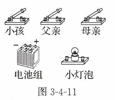 8. 由父亲、母亲、小孩组成的三口之家,要用投票方式决定是否在暑假去北京旅游,如果小孩要去,且父母中至少有一位要去,则他们就去旅游。请用 3 个开关、1 个电池组和 1 个小灯泡及若干导线设计一架投票表决机,某人的开关闭合表示他要去,若最终小灯泡亮了,他们就可以在暑假去旅游了。请在虚线框内画出电路图并连接如图 3 - 4 - 11 所示的实物图。(对应目标:913401)