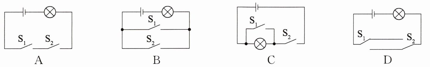 7. 小伊家装修房子设计楼梯照明电路时,希望通过楼上楼下安装两个开关,方便随时独立操控自家门口同一走廊灯泡的亮灭,图 3 - 4 - 10 中的电路图设计正确的是(