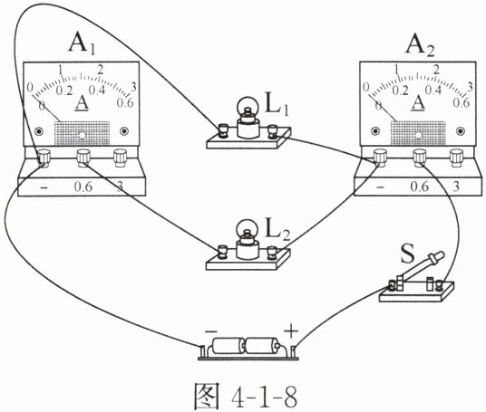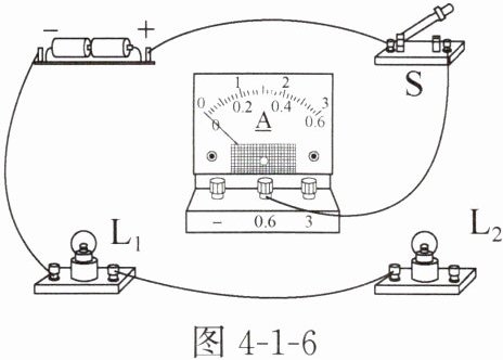 7. 请用笔画线代替导线将图4-1-6中的电路连接完整。要求:灯L₁、L₂并联,开关S控制整个电路,电流表测量干路电流,导线不能交叉。(对应目标:914103)