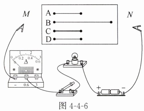 实验室提供了4根不同的电阻丝,规格、材料如下表所示。为了验证上述猜想,他设计了如图4-4-6所示的实验电路,部分实验步骤如下。