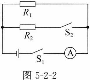 4. 如图 5 - 2 - 2 所示,电源电压保持不变,定值电阻的阻值$R_{1}=10\Omega$。当开关$S_{1}$、$S_{2}$均闭合时,电流表的示数为$0.5A$,然后只将开关$S_{2}$断开,电流表的示数变化了$0.2A$,定值电阻的阻值$R_{2}$为(