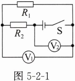 3. 如图 5 - 2 - 1 所示的电路中,$R_{1}=5\Omega$,闭合开关$S$,电压表$V_{1}$与$V_{2}$的示数分别为$2V$和$6V$,则$R_{2}$的阻值是(