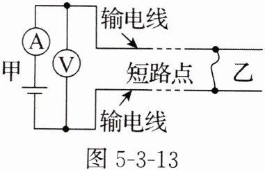 13. 甲、乙两地相距40km,在甲、乙两地之间沿直线架设了两条输电线,已知每条输电线每千米的电阻为0.2Ω。现输电线在某处发生了短路,为确定短路位置,检修员在甲地利用电压表、电流表和电源接成如图5-3-13所示电路进行测量。当电压表的示数为3.0V时,电流表的示数为0.5A。求:(对应目标:915301)