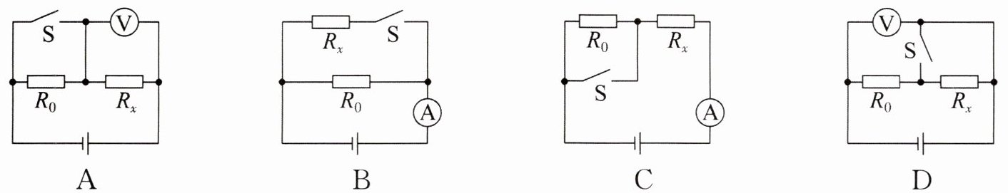 D 解析 由题图A可知,电压表可以测量总电压U和两电阻串联时$R_x$两端的电压,则$R_x$的阻值为$R_x=\frac{U_x}{\frac{U - U_x}{R_0}}=\frac{U_x}{U - U_x}R_0$。由题图B可知,电流表可以测量干路总电流I和通过$R_0$的电流$I_0$,则$R_x$的阻值$R_x=\frac{U}{I_x}=\frac{I_0R_0}{I - I_0}$。由题图C可知,电流表可以测量S闭合时通过$R_x$的电流$I_x$和两电阻串联连时电路中的电流I,则$R_x$的阻值$R_x=\frac{IR_0}{I_x - I}$。由题图D可知,电压表始终测量电源电压,无法计算待测电阻。