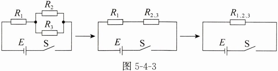 7. 将复杂电路等效为一个简单电路的过程如图 5 - 4 - 3 所示,已知 $ R_2 = R_3 = 10 \Omega $,$ R_1 = 5 \Omega $,则可知 $ R_{2,3} = $