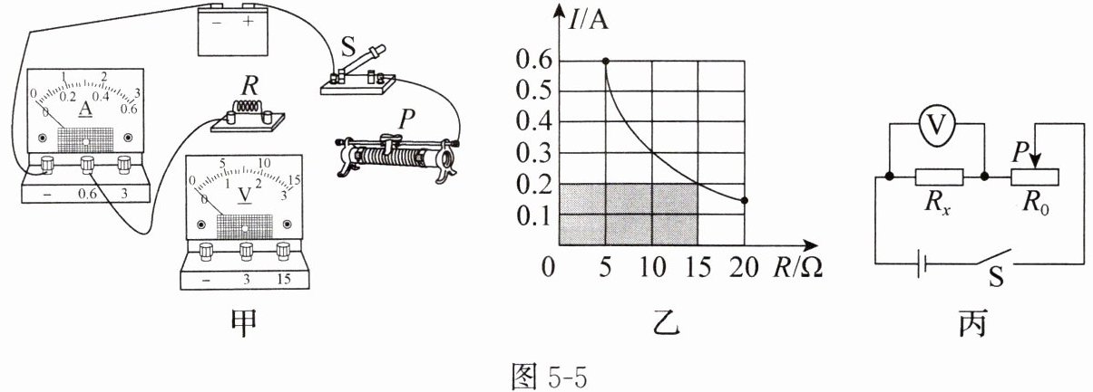 2U(外推计算错误),正确是:设U不变,$I_1(R_1+R_{滑1}) = I_2(R_2+R_{滑2}),$已知$I_1 = 0.2A,$$R_1 = 10\Omega,$$I_2 = 0.4A,$$R_2 = 5\Omega,$$0.2×(10+R_{滑1}) = 0.4×(5+R_{滑2}),$由于在同一电路,电源电压不变,$U = I(R_x+R_{滑}),$当I = 0.2A,$R = 10\Omega,$$U = 0.2×(R_x+R_{滑1}),$当I = 0.4A,$R = 5\Omega,$$U = 0.4×(R_x+R_{滑2}),$$0.2×(R_x+R_{滑1}) = 0.4×(R_x+R_{滑2}),$又因为从图乙,当R = 0时,I = 0.6A,U = I× R_x=0.6R_x,当$R = 5\Omega,$I = 0.4A,$U = 0.4×(R_x + R_{滑}),$当$R = 10\Omega,$I = 0.2A,$U = 0.2×(R_x+R_{滑}'),$由U不变,当I = 0.6A,R = 0,U = 0.6R_x,当I = 0.2A,$R = 10\Omega,$$U = 0.2×(R_x + R_{滑}),$当$R_{滑}=0$时,U = 0.6R_x,当$R = 10\Omega,$I = 0.2A,$U = 0.2×(R_x+R_{滑}),$因为U不变,$0.6R_x=0.2×(R_x+R_{滑}),$$3R_x=R_x+R_{滑},$$R_{滑}=2R_x,$从图乙,当$R = 5\Omega,$I = 0.4A,$U = 0.4×(R_x+R_{滑1}),$$0.6R_x=0.4×(R_x+R_{滑1}),$$3R_x=2R_x + 2R_{滑1},$$R_x=2R_{滑1},$结合前面,设R_x为固定电阻,由U = I(R_x+R)(R为图乙中电阻),当I = 0.2A,$R = 10\Omega,$U = 0.2×(R_x+10),当I = 0.4A,$R = 5\Omega,$U = 0.4×(R_x+5),0.2×(R_x+10)=0.4×(R_x+5),0.2R_x+2 = 0.4R_x+2,0.2R_x=0,错误,重新取点(5,0.4)和(10,0.2),U = I(R_x + R),0.4×(R_x+5)=0.2×(R_x+10),0.4R_x+2=0.2R_x+2,0.2R_x=0,发现一直得R_x = 0错误,我们以U不变,当R = 0,I = 0.6A,U = 0.6R_x,当$R = 5\Omega,$I = 0.4A,$U = 0.4×(R_x+R_{滑}),$当$R = 10\Omega,$I = 0.2A,$U = 0.2×(R_x+R_{滑}'),$由$0.6R_x=0.4×(R_x+R_{滑1}),$$3R_x=2R_x+2R_{滑1},$$R_x=2R_{滑1},$$0.6R_x=0.2×(R_x+R_{滑2}),$$3R_x=R_x+R_{滑2},$$R_{滑2}=2R_x,$从图乙,当I = 0.2A,$R = 10\Omega,$$U = 0.2×(R_x+R_{滑2}),$U = 0.6R_x,0.6R_x=0.2×(R_x+2R_x),0.6R_x=0.6R_x,由图乙,当I = 0.2A,$R = 10\Omega,$设R_x,U = I(R_x+R),U = 0.2×(R_x+10),当I = 0.6A,R = 0,U = 0.6R_x,0.6R_x=0.2×(R_x+10),3R_x=R_x+10,2R_x=10,$R_x = 5\Omega,$U = 0.6×5=3V。2. 图丙中,R_x与$R_0$串联,电压表测R_x两端电压,当滑片P在右端时,$R_0$全部接入电路,由图乙,当R较大时,电流较小,当$R = 10\Omega,$I = 0.2A,此时$R_0$全部接入,$U = I(R_x+R_0)=0.2×(5+R_0),$又U = 3V,$3=0.2×(5+R_0),$$15 = 5+R_0,$$R_0 = 10\Omega,$当滑片P在左端时,$R_0$接入电阻为0,$I=\frac{U}{R_x}=\frac{3}{5}=0.6A,$电压表示数U_x = 3V,当滑片P在右端,I = 0.2A,U_x=IR_x=0.2×5 = 1V。本题答案为:$5\Omega;$3V;$10\Omega;$0.2至0.6A;1至3V。