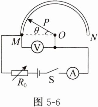 6. (江苏宿迁中考)新房装修时,工人经常用普通量角器测量一些角度,不方便读数。小明根据所学的知识设计了电子量角器,电路如图 5 - 6 所示,电流表的测量范围为 0~0.6 A,电压表的测量范围为 0~3 V,O 为半圆弧电阻 MN 的圆心,金属滑片 OP 为半径,与半圆弧接触良好,接入电路的电阻$ R_{MP} $与指针旋转角度 θ 成正比,电源电压恒为 6 V,R₀ 为电阻箱。将滑片 OP 旋转至 M 处,调节 R₀ 的阻值,使电路中电流为 0.6 A。