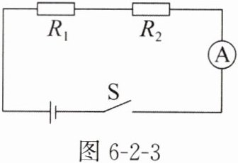 6. 如图 6 - 2 - 3 所示,电源电压不变,定值电阻 $ R_1 $ 阻值为 10 Ω,定值电阻 $ R_2 $ 阻值为 20 Ω,且开关 S 闭合后电流表的示数为 0.2 A。求:(对应目标:916203)
