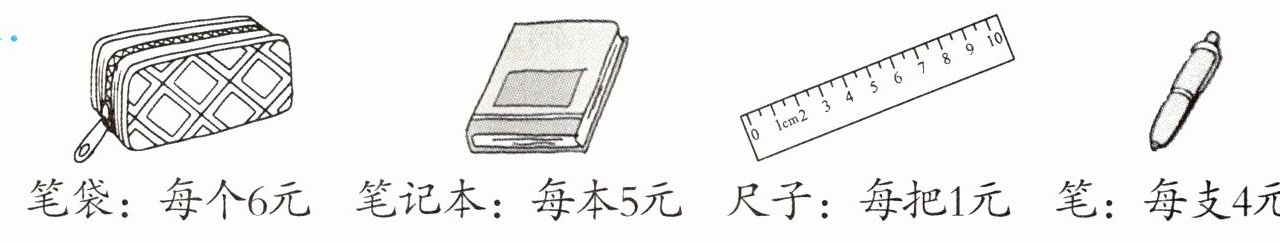 笔袋:每个6元 笔记本:每本5元 尺子:每把1元 笔:每支4元