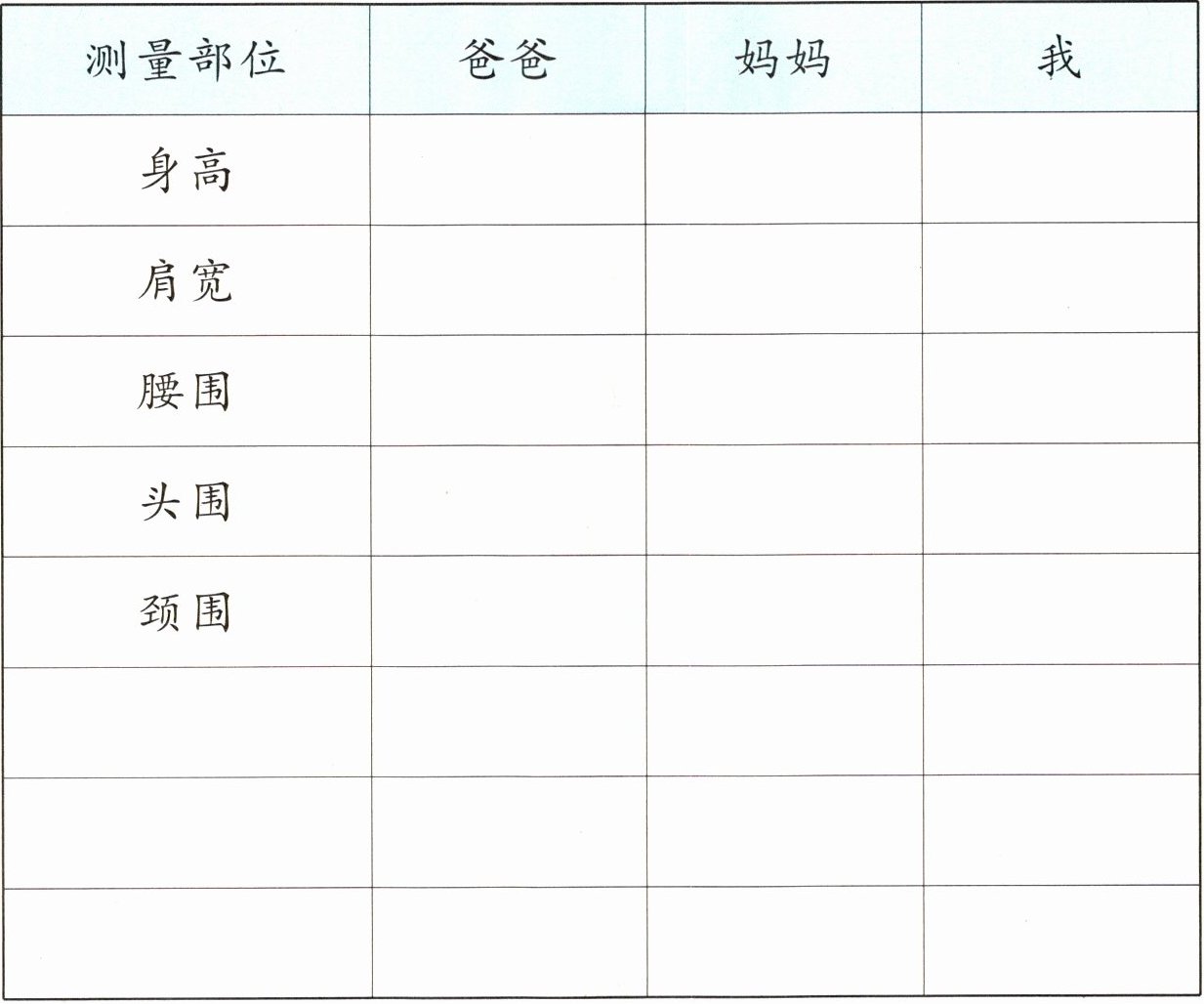 1. 你知道身体上一些部位的长度吗?量一量,并把测量的结果(用厘米或米作单位)记录在下表中。