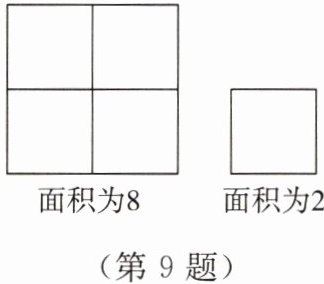 9.解:如图,大正方形的面积为2,则它的边长为$\sqrt{2}$;小正方形的面积为$\frac{1}{2}$,则它的边长为$\sqrt{\frac{1}{2}}$。借助这个图形可以知道大正方形的边长是小正方形边长的2倍,即$\sqrt{\frac{1}{2}}=\frac{\sqrt{2}}{2}$。