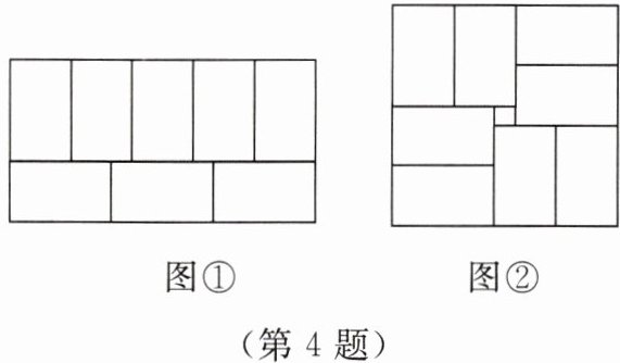 4. 小刚在拼图时,发现 8 个一样大的小长方形恰好可以拼成一个大长方形,如图①所示,小明看见了说:“我来试一试。”结果小明七拼八凑,拼成一个如图②所示的大正方形,中间留下一个边长恰好为 2 cm 的小正方形,你能算出小长方形的长和宽吗?