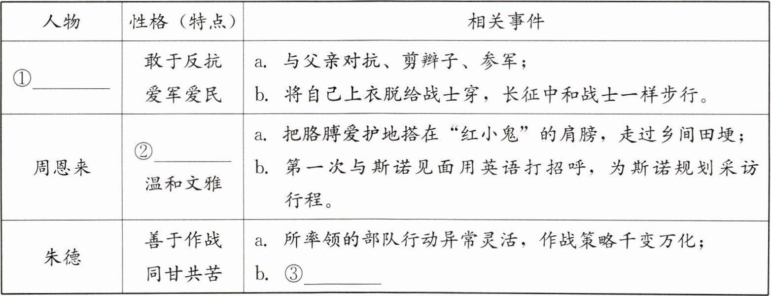 |①______|敢于反抗爱军爱民|a. 与父亲对抗、剪辫子、参军;b. 将自己上衣脱给战士穿,长征中和战士一样步行。|