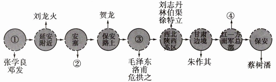 1. ①西安 ②周恩来 ③保安 ④彭德怀、徐海东、“红小鬼”、朱德