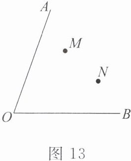 (3)如图 13,在 $ \angle AOB $ 内部有 $ M $,$ N $ 两点,在 $ OA $,$ OB $ 上是否分别存在点 $ E $,$ F $,使得 $ E $,$ F $,$ M $,$ N $ 四点组成的四边形的周长最小,找出 $ E $,$ F $ 两点。(保留作图痕迹,并说明找点的过程及理由)