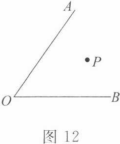 (2)如图 12,在 $ \angle AOB $ 内部有一点 $ P $,在 $ OA $,$ OB $ 上是否分别存在点 $ E $,$ F $,使得 $ E $,$ F $,$ P $ 三点组成的三角形的周长最小,找出 $ E $,$ F $ 两点。(保留作图痕迹,并说明找点的过程及理由)