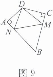 3. 如图 9,在四边形 $ ABCD $ 中,$ \angle DAB = \angle DCB = 90° $,$ M $,$ N $ 分别是 $ BC $,$ AB $ 边上的动点,$ \angle ADC = 122° $,当 $ \triangle DMN $ 的周长最小时,$ \angle MDN $ 的度数是( )。