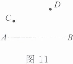 5. (1)如图 11,在直线 $ AB $ 的同一侧有两点 $ C $,$ D $,在 $ AB $ 上找一点 $ P $,使 $ C $,$ D $,$ P $ 三点组成的三角形的周长最小,找出此点。(保留作图痕迹,并说明找点的过程及理由)