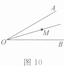 4. 如图 10,$ \angle AOB = 30° $,点 $ M $ 是 $ \angle AOB $ 内任意一个点,$ OM = 5 $,若 $ OA $ 上存在点 $ P $,$ OB $ 上存在点 $ Q $ 使得 $ \triangle MPQ $ 的周长最小,则最小值为 ______。