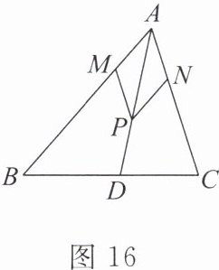9. [教材第 10 页习题 13.2 第 8 题变式]如图 16,AD 是△ABC 的角平分线,点 P 为 AD 上一点,PM//AC 交 AB 于点 M,PN//AB 交 AC 于点 N.图中∠APM 与∠APN 有什么数量关系? 为什么?