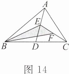 7. 如图 14,在△ABC 中,已知点 D,E,F 分别是 BC,AD,CE 的中点,且△ABC 的面积为 16,则△BEF 的面积是(