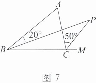 3. 如图7,BP是△ABC中∠ABC的平分线,CP是△ABC的外角∠ACM的平分线。若∠ABP= 20°,∠ACP= 50°,则∠P=