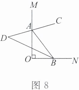 4. 如图8,∠MON= 90°,点A,B分别在射线OM,ON上移动(不与点O重合),AC平分∠MAB,AC的反向延长线与∠ABO的平分线相交于点D。