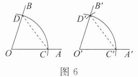 (1)如图6,以点$O$为圆心,任意长为半径作弧,分别交$OA$,$OB于点C$,$D$;(2)作射线$O'A'$,以点$O'$为圆心,$OC$长为半径作弧,交$O'A'于点C'$;以点$C'$为圆心,$CD$长为半径作弧,两弧交于点$D'$;(3)过点$D'作射线O'B'$,则$\angle A'O'B'= \angle AOB$.