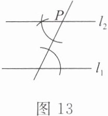 2. 如图13,过直线$l_1外一点P作直线l_1的平行线l_2$,其作图依据是(