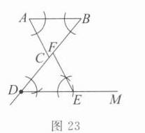 在综合实践课上,老师让同学们在已知三角形的基础上,经过画图,探究两个三角形边之间的关系.如图18,已知点$D在\triangle ABC的边BC$的延长线上,过点$D作\angle BDM= \angle B且DM// AB$,在$DM上截取DE= AB$,再作$\angle DEF= \angle A交线段BC于点F$.