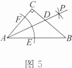 1. [2024天津中考]如图5,Rt△ABC中,∠C= 90°,∠B= 40°,以点A为圆心,适当长为半径作弧,交AB于点E,交AC于点F;再分别以点E,F为圆心,大于$\frac{1}{2}EF$的长为半径作弧,两弧(所在圆的半径相等)在∠BAC的内部相交于点P;画射线AP,与BC相交于点D,则∠ADC的大小为(