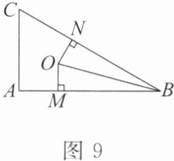11. 如图 9,点$O在一块直角三角尺ABC$上(其中$∠ABC = 30^{\circ}$),$OM \perp AB于点M$,$ON \perp BC于点N$。若$OM = ON$,则$∠ABO = $
