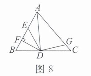 10. 如图 8,$AD是\triangle ABC$的角平分线,$DF \perp AB$,垂足为$F$,$E$,$G分别是AB$,$AC$上的点,$DE = DG$,则$∠AED + ∠AGD$等于( )。