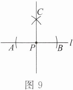 3. 如图 9,用直尺和圆规过直线 $l$ 上一点 $P$ 作已知直线 $l$ 的垂线,图中的点 $C$ 是分别以点