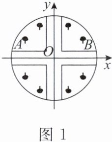 1. [2023 山东临沂中考·生活情境]某小区的圆形花园中间有两条互相垂直的小路,园丁在花园中栽种了 8 棵桂花树,如图 1 所示.若$A$,$B$两处桂花树的位置关于小路对称,在分别以两条小路为$x$,$y$轴的平面直角坐标系中,若点$A的坐标为(-6,2)$,则点$B$的坐标为(