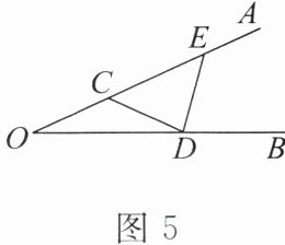 2. [数学文化]“三等分角”大约是在公元前5世纪由古希腊人提出来的。借助如图5所示的“三等分角仪”能三等分任一角,这个“三等分角仪”由两根有槽的棒OA,OB组成,两根棒在点O相连并可绕O转动,点C固定,OC= CD= DE,点D,E可在槽中滑动。若∠BDE= 75°,则∠O=