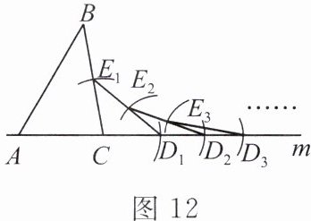 6. 如图12,已知△ABC的边AC在直线m上,∠ACB= 80°,以点C为圆心,$\frac{1}{2}BC$的长为半径作弧,交直线m于点$D_{1}$,交边BC于点$E_{1}$,连接$D_{1}E_{1}$;又以点$D_{1}$为圆心,$\frac{1}{2}D_{1}E_{1}$的长为半径作弧,交直线m于点$D_{2}$,交$D_{1}E_{1}于点E_{2}$,连接$D_{2}E_{2}$;又以点$D_{2}$为圆心,$\frac{1}{2}D_{2}E_{2}$的长为半径画弧,交直线m于点$D_{3}$,交$D_{2}E_{2}于点E_{3}$,连接$D_{3}E_{3}$……按照此方法继续作图,则∠$E_{n}D_{n}D_{n - 1}$= ____。(用含n的式子表示,n为大于1的整数)