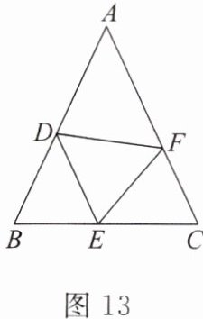 7. [教材第 93 页复习题 15 第 11 题变式]如图 13,在 $\triangle ABC$ 中,$AB= AC$,点 $D$,$E$,$F$ 分别在 $AB$,$BC$,$AC$ 边上,且 $BE= CF$,$BD= CE$.