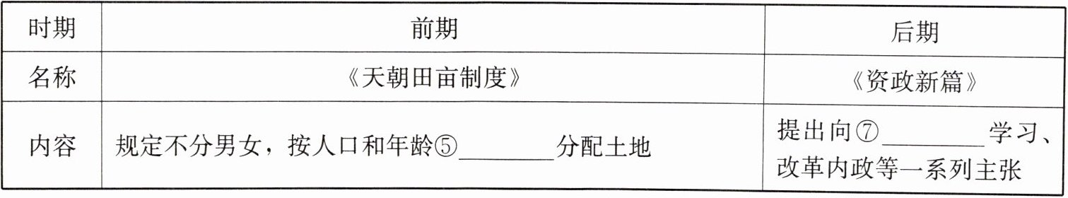|内容|规定不分男女,按人口和年龄⑤______分配土地|提出向⑦______学习、改革内政等一系列主张|