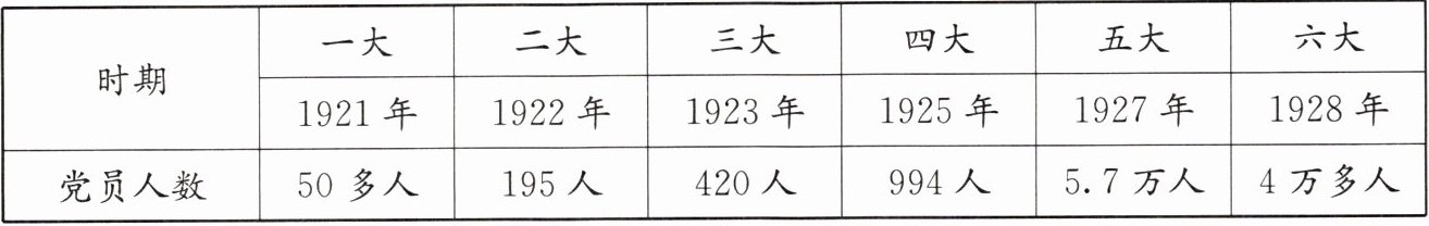 (2)根据材料,指出从中共五大到六大党员人数的变化,并结合所学知识,简析出现这一变化的原因。