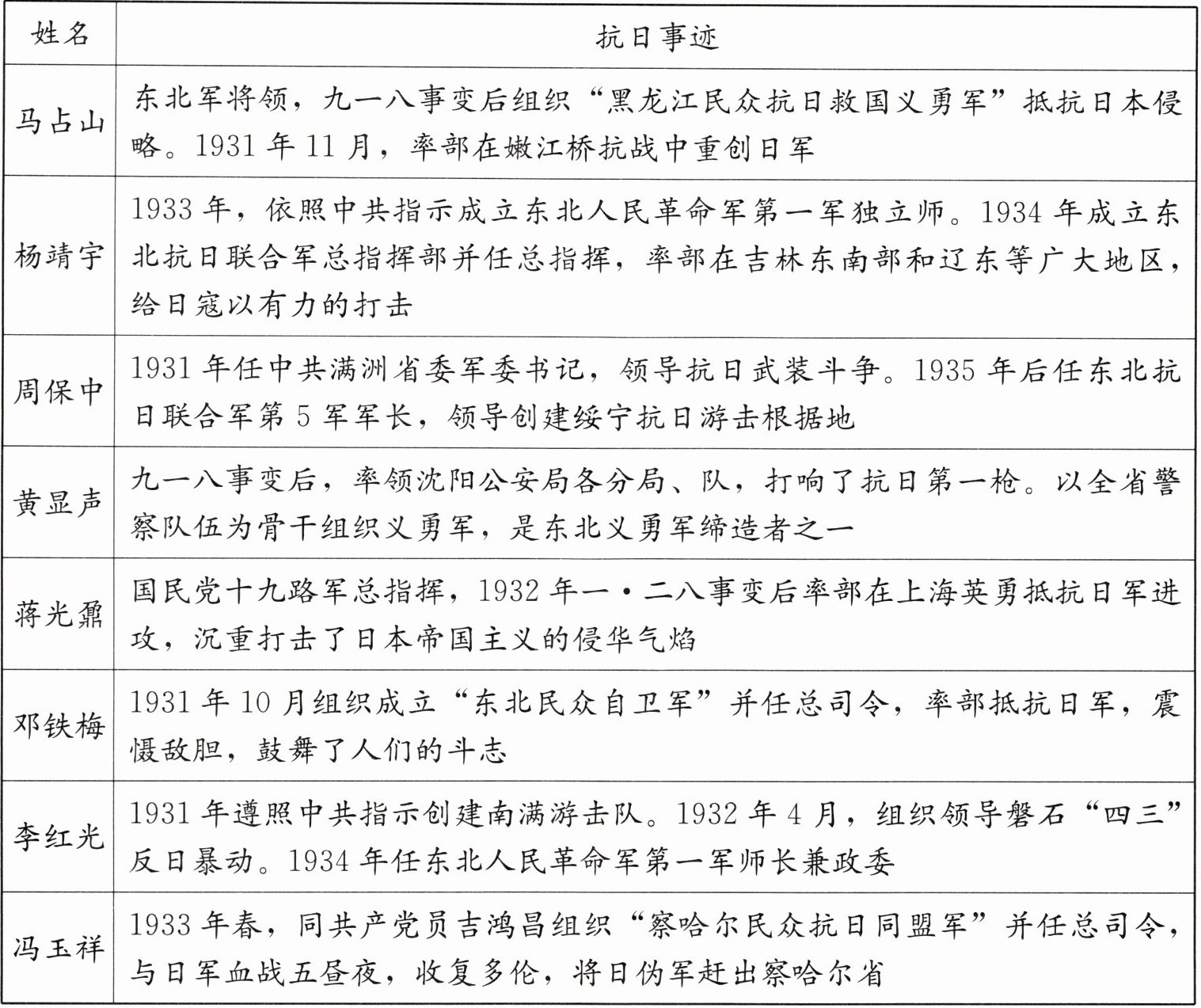 材料 九一八事变后,无数先烈为挽救民族危亡进行了英勇抵抗。其间,涌现出大批抗日英雄。下表为 1931—1936 年间抗日英雄简介(部分)